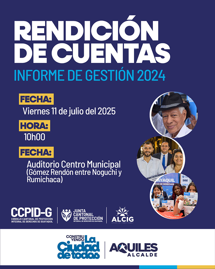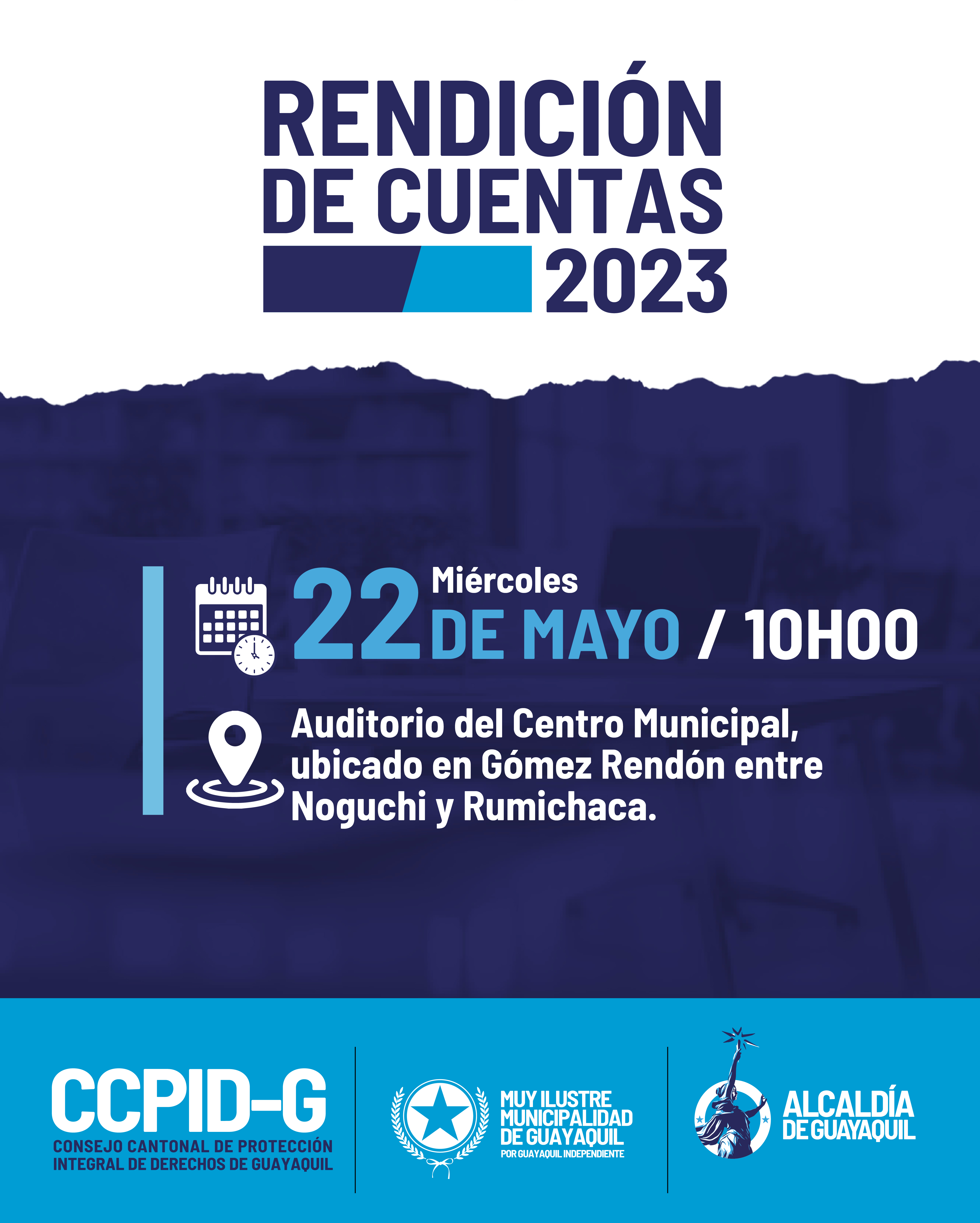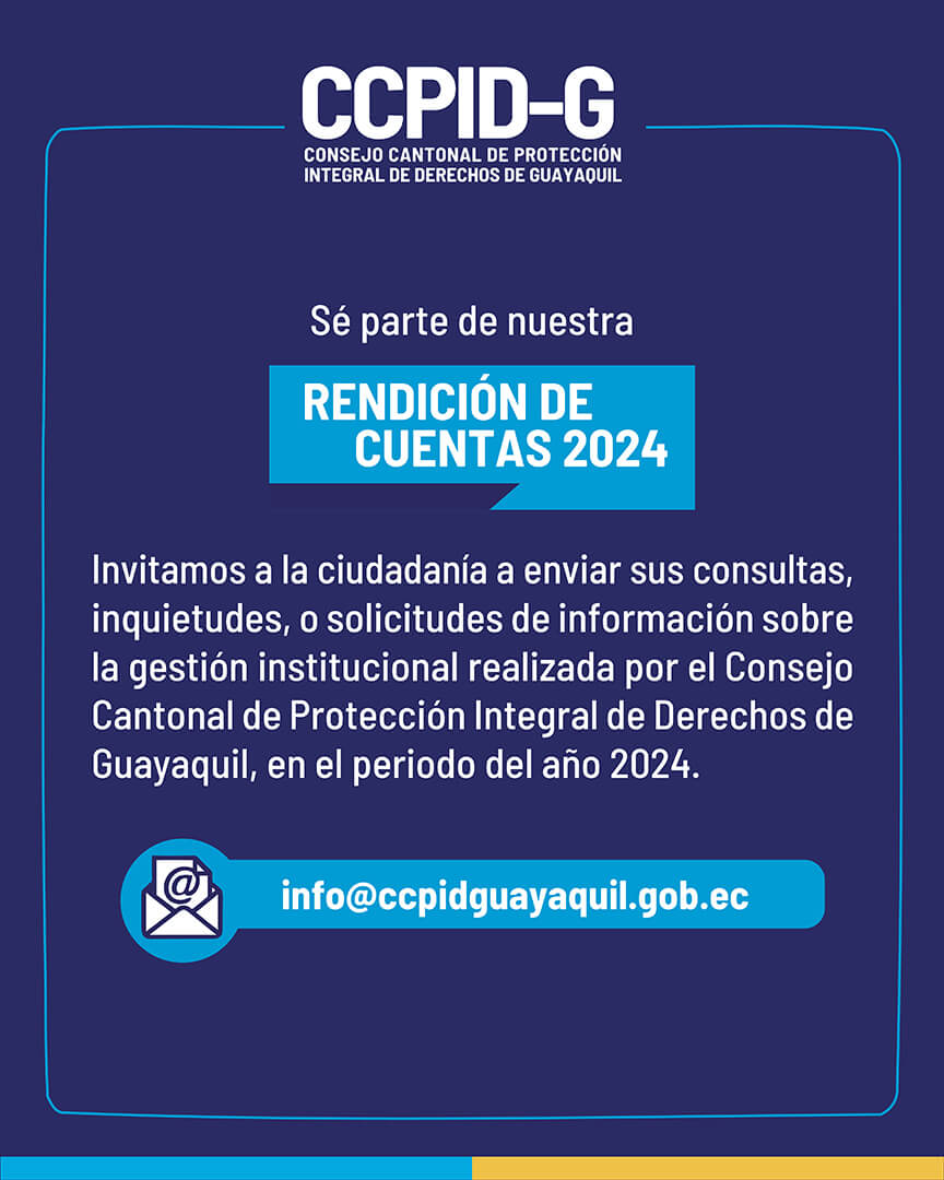 En cumplimiento al Art. 11 de la Ley Orgánica del Consejo de Participación Ciudadana y Control Social, el Consejo Cantonal de Protección Integral de Derechos de Guayaquil, realiza el proceso de Rendición de Cuentas de cada ejercicio fiscal.